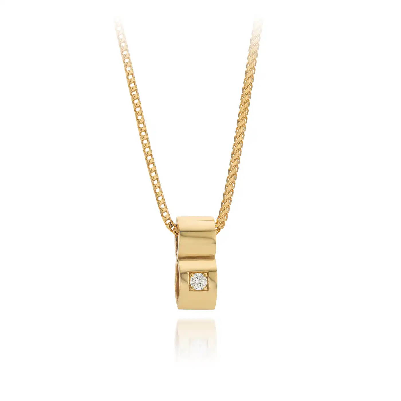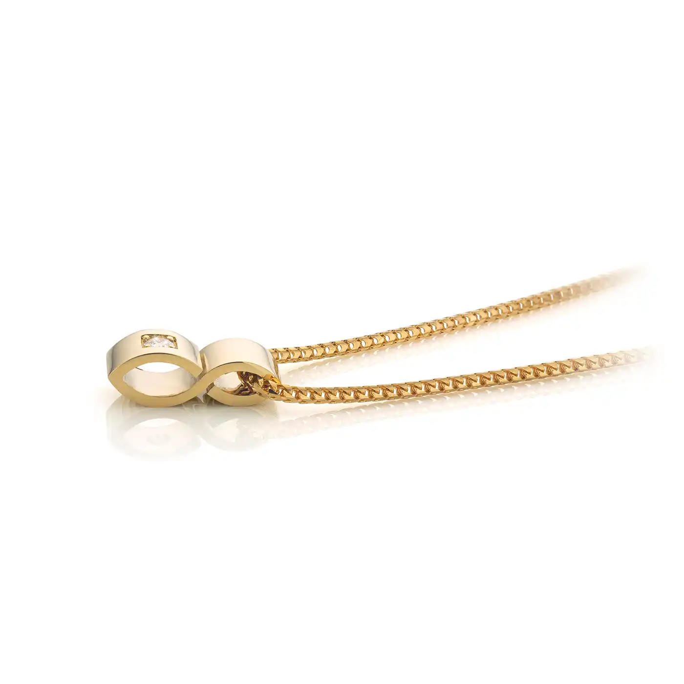 This 14K yellow gold infinity pendant with its hidden mystique just has the x-factor. The fact that it can be seen so ‘en-profile’ just makes have extra special. The brilliant cut diamond in River-E/LC quality (loupe clean) weighing 0.08 carats, ensures a lifetime of brilliance.