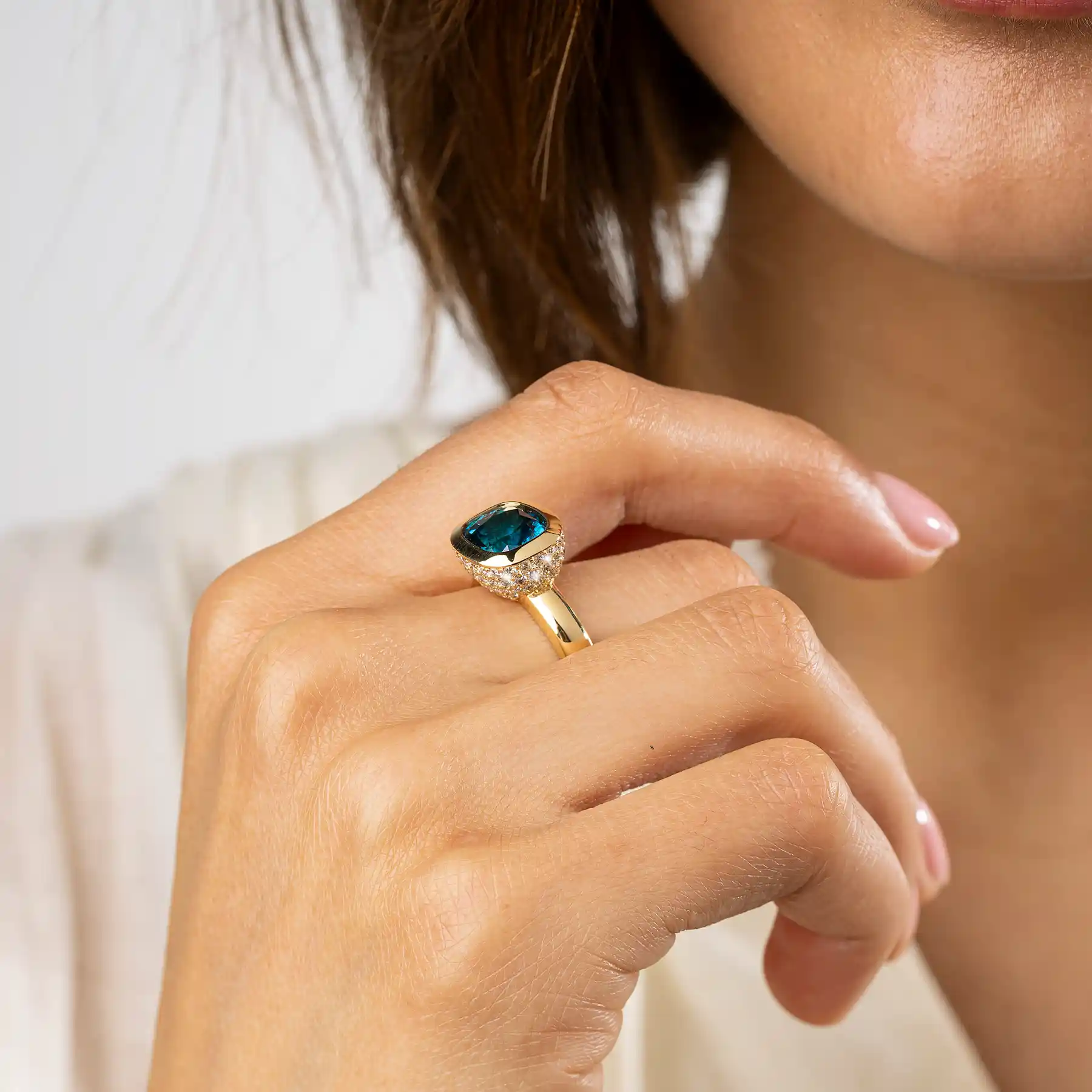 18 karaat geelgouden ring. De kast is helemaal pavé gezet met 76 briljant geslepen diamanten met een totaal gewicht van 1,08 ct. Centraal gezet met een Blauwe zirkoon van 5,58 ct.