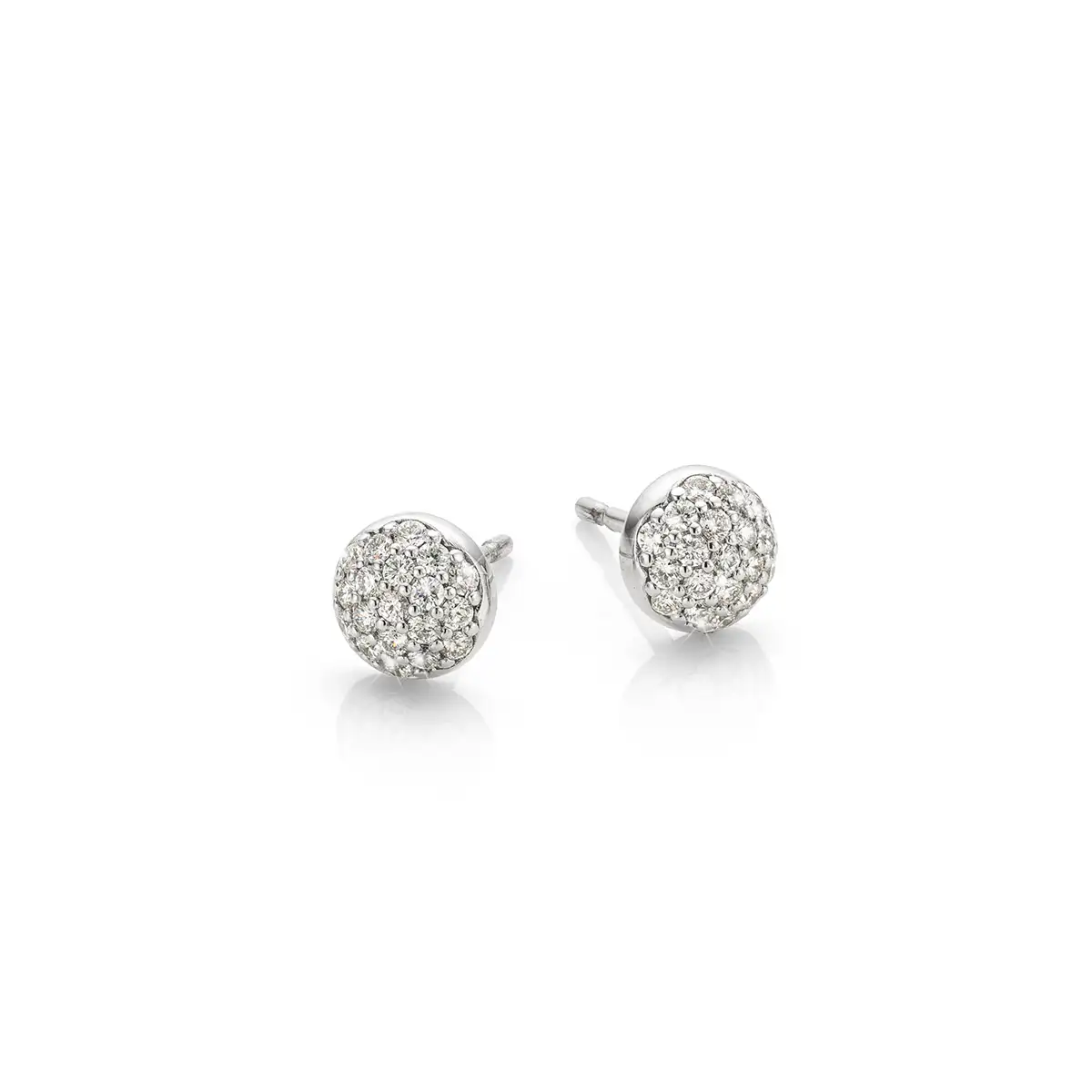 18 karaat witgouden oorstekers in de vorm van een halve bol. Pavé gezet met elk 19 x 0,01 ct. briljant geslepen diamanten.
