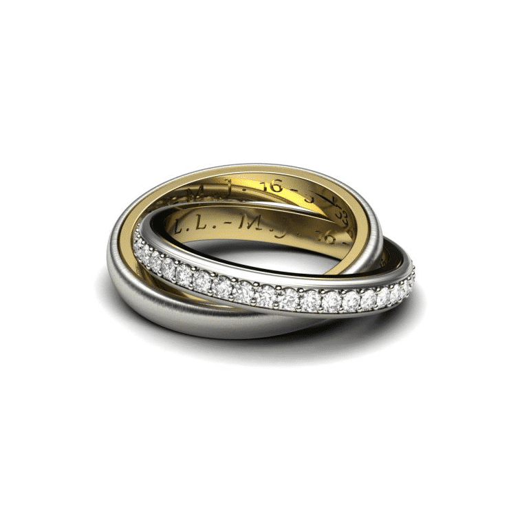 Om de trouwringen van u en uw partner zijn witgouden ringen gemonteerd zonder ook maar iets van de gravure aan te tasten. Indien gewenst wordt één van de twee ringen gezet met Briljant geslepen Diamanten (zoals het voorbeeld). Wij monteren de ringen op een dusdanige manier dat de ringen het zetwerk van de Diamanten niet buitensporig beschadigen. Het toegevoegde goud is, mits door ons geleverd Fairtrade. U kunt ook uw eigen goud hierin laten verwerken. Indien wij uw goud omsmelten of as plaatsen filmen wij dit proces altijd en sturen dit aan u door.
