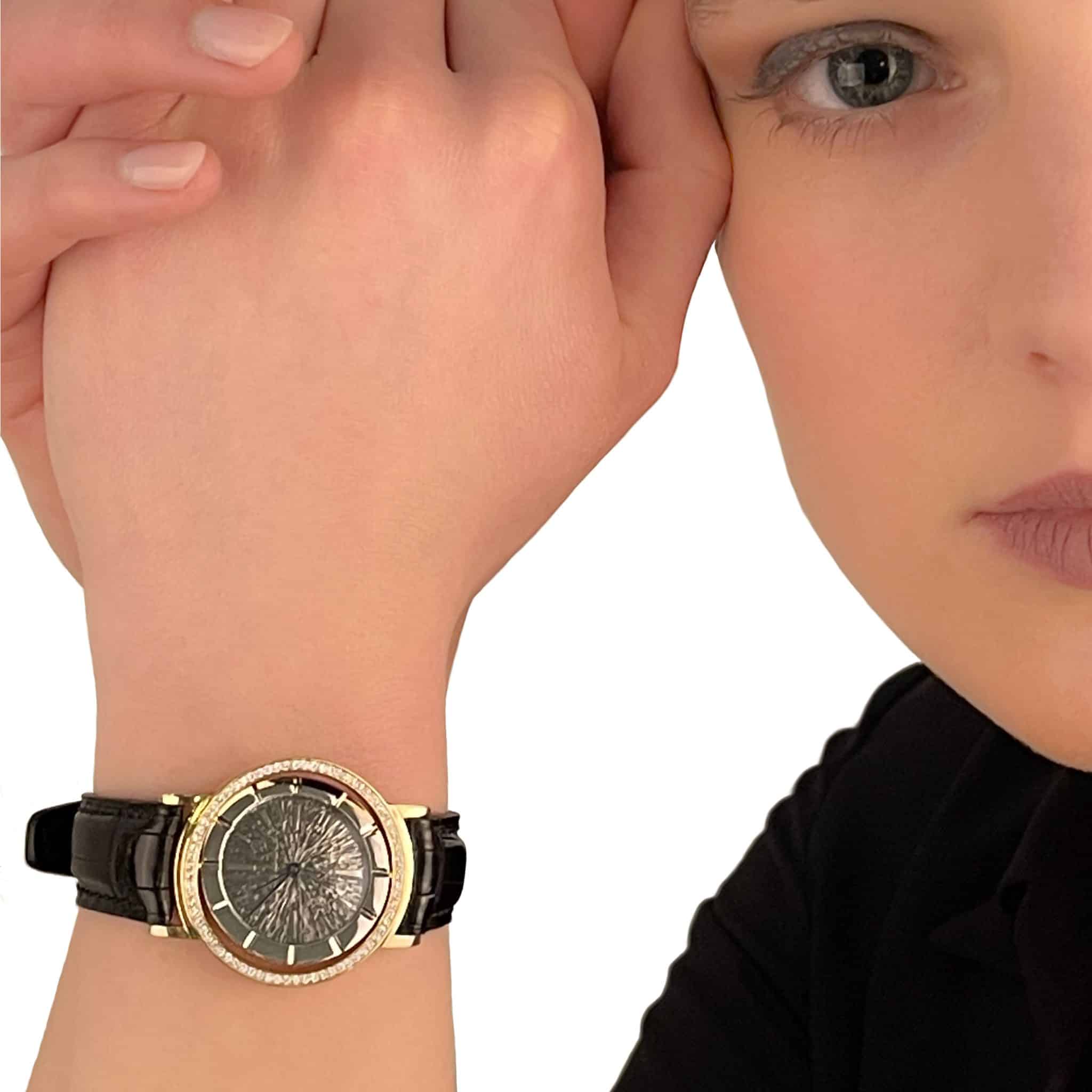 Uitermate bijzonder 18K geel- en witgouden handgemaakte quartz horloge. De wijzerplaat is helemaal rond te draaien in het geelgouden “frame” dat helemaal rondom bezet is met Diamanten.