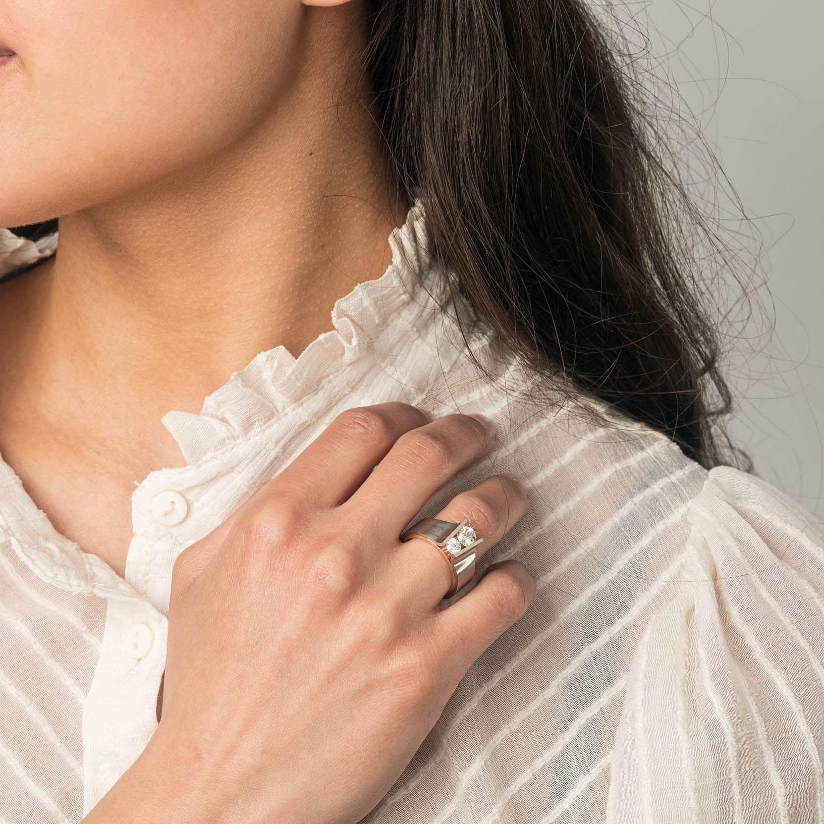 Dit gedenksieraad is gemaakt om de trouwringen van u en uw dierbare heen. De buitenmantel wordt over uw eigen ringen heen gemonteerd zodat u de oorspronkelijke ring toch blijft zien. De gravure wordt op deze manier volledig behouden. In het getoonde voorbeeld zijn excellent Briljant geslepen Diamanten gezet (1 x 0,66 ct. FB/VS1 en 1 x 0,30 ct. D/VS1) Als u wilt kunnen wij altijd as van uw dierbare in het ontwerp verwerken. Het toegevoegde goud is, mits door ons geleverd Fairtrade. U kunt ook uw eigen goud hierin laten verwerken. Indien wij uw goud omsmelten of as plaatsen filmen wij dit proces altijd en sturen dit aan u door.