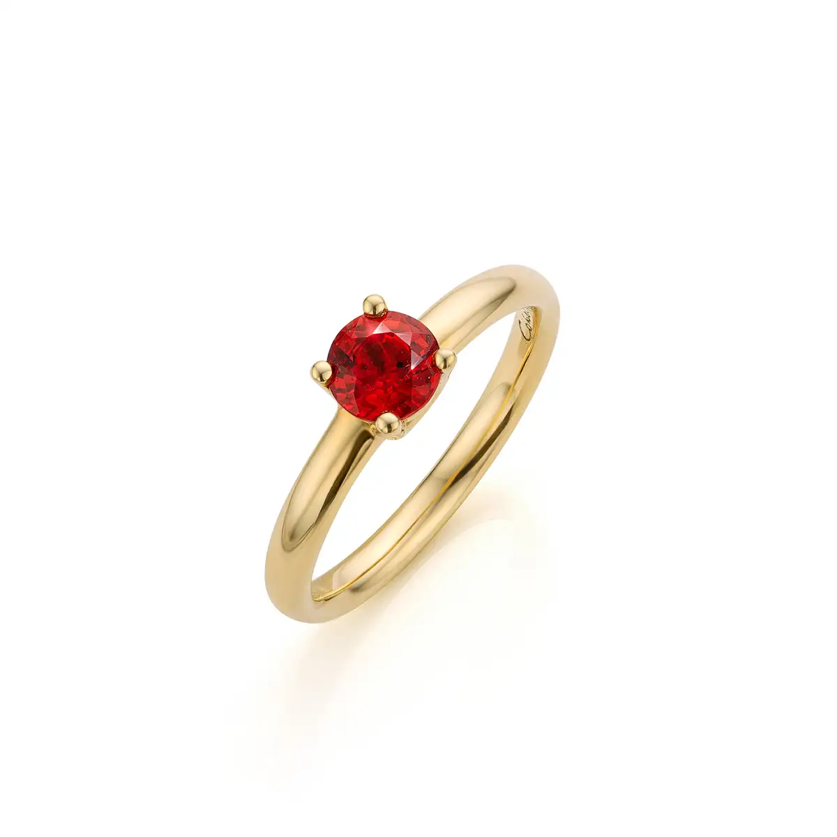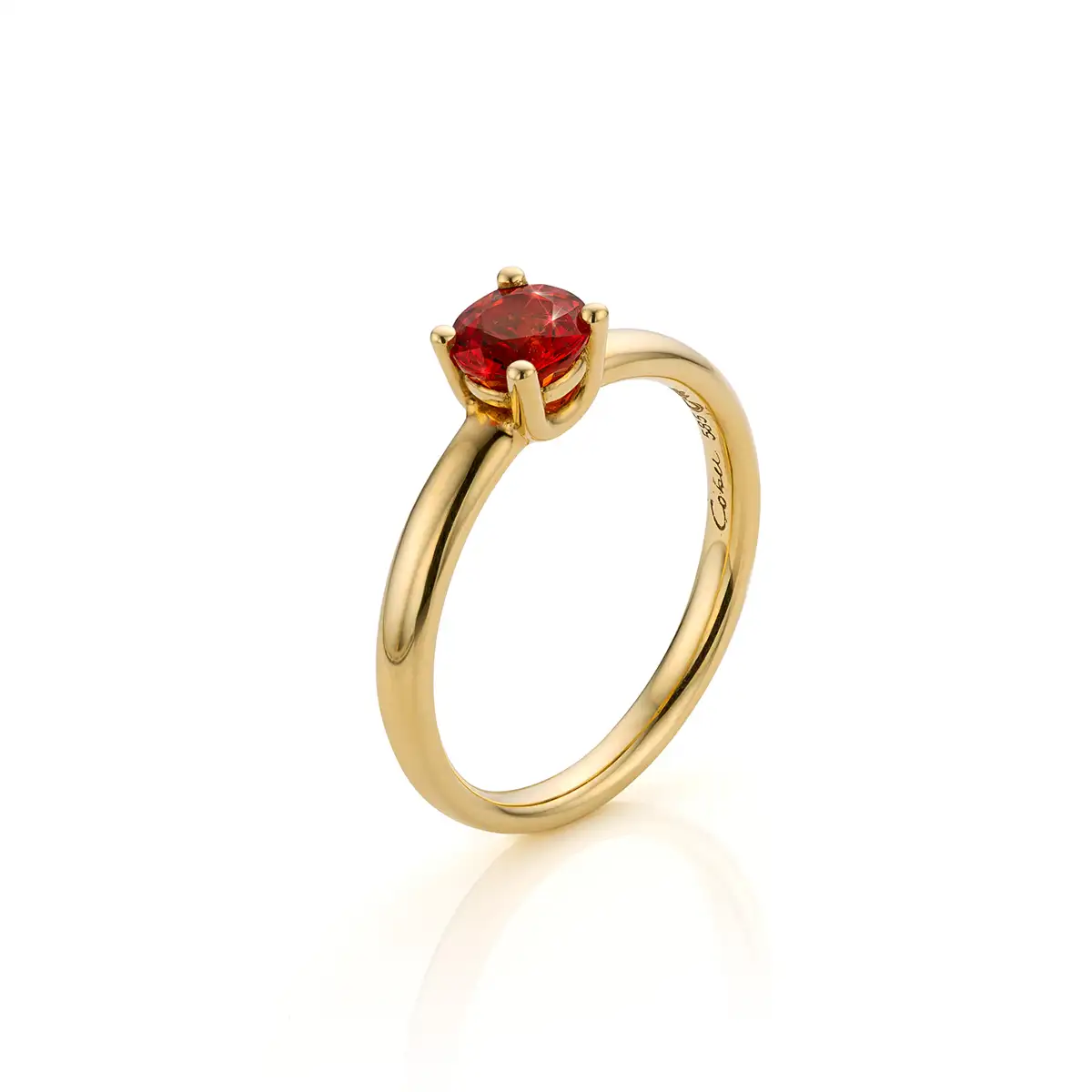Elegante ring gemaakt van 14K geelgoud. Centraal gezet vindt u een gemengd rond geslepen levendige oranje saffier in de zuiverheid VS
