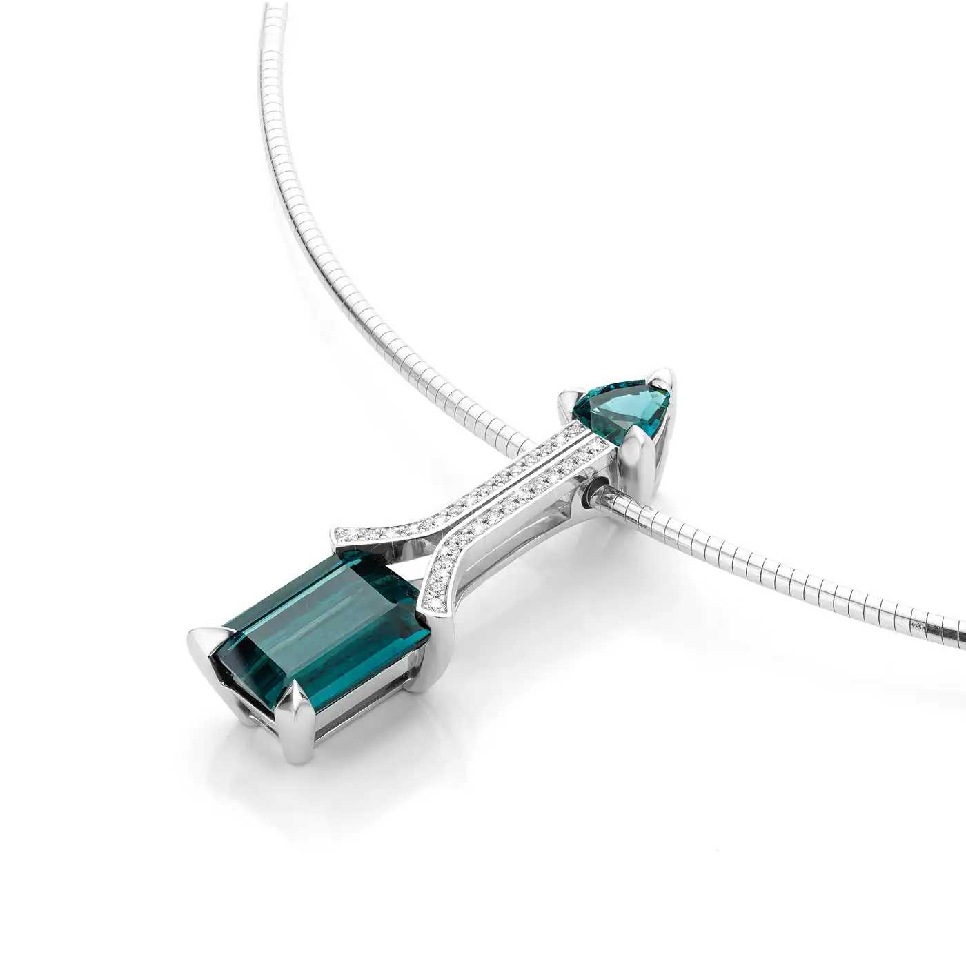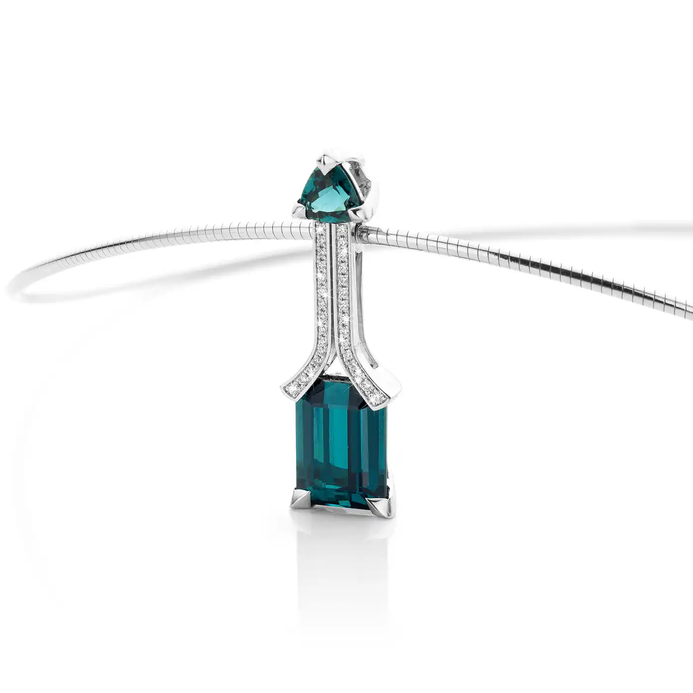 Elegante hanger met Smaragd geslepen loepzuivere Indigoliet-Tourmalijn en een Triljant geslepen Indigoliet (VS), verbonden door loepzuivere Diamanten (E/LZ). Gemaakt van 18K fair trade goud. Unica. Let op, de prijs is exclusief het collier.