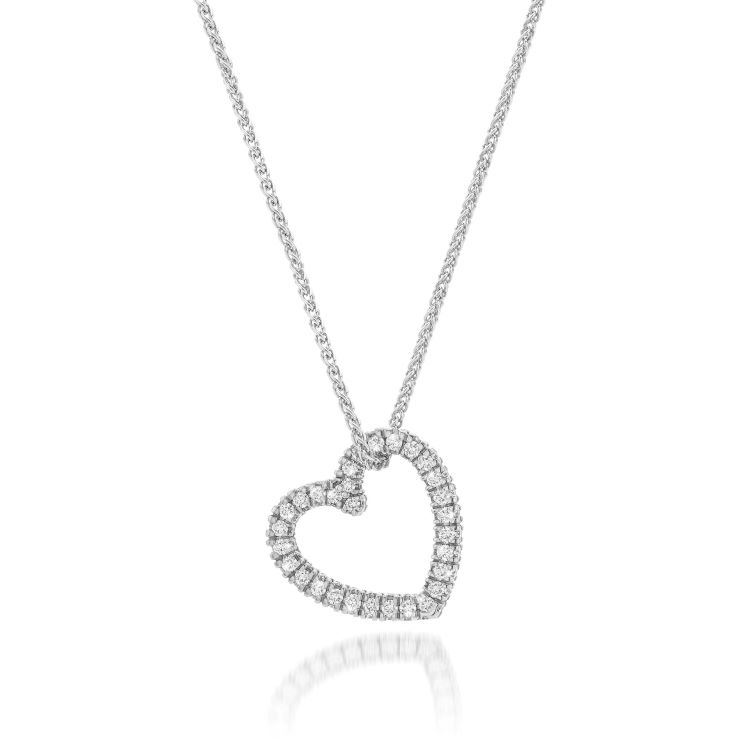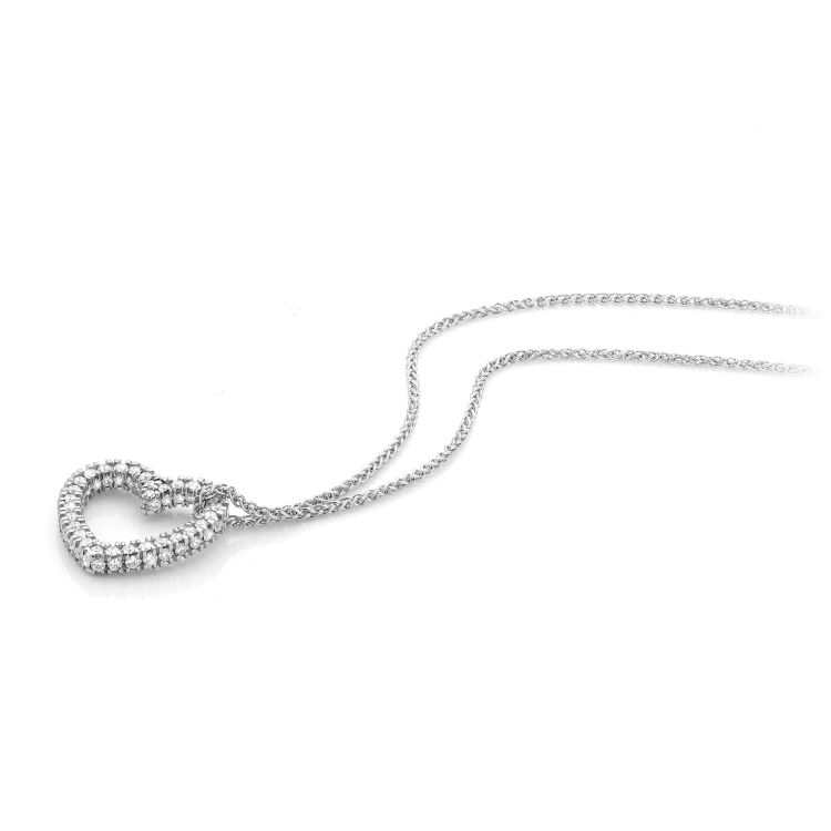 Deze 18K witgouden hart hanger is vollledig bezet met 118 topkwaliteit diamanten, in de kwaliteit River-E/LC (loupe clean) met een gewicht van 1.25 samen. Dat verzekert u van een levenslange schittering. En bedenk, deze ingetogen chique harthanger kan altijd.