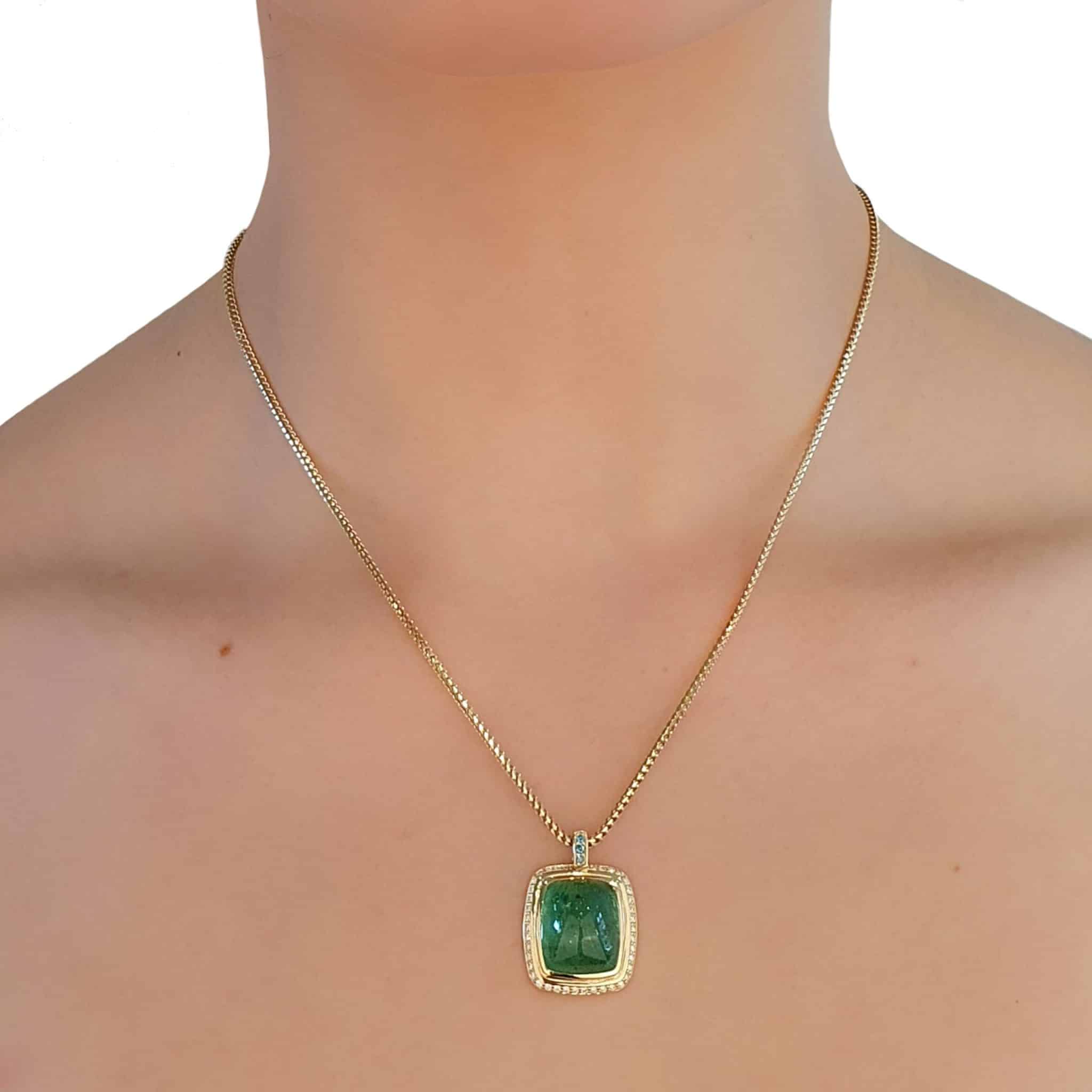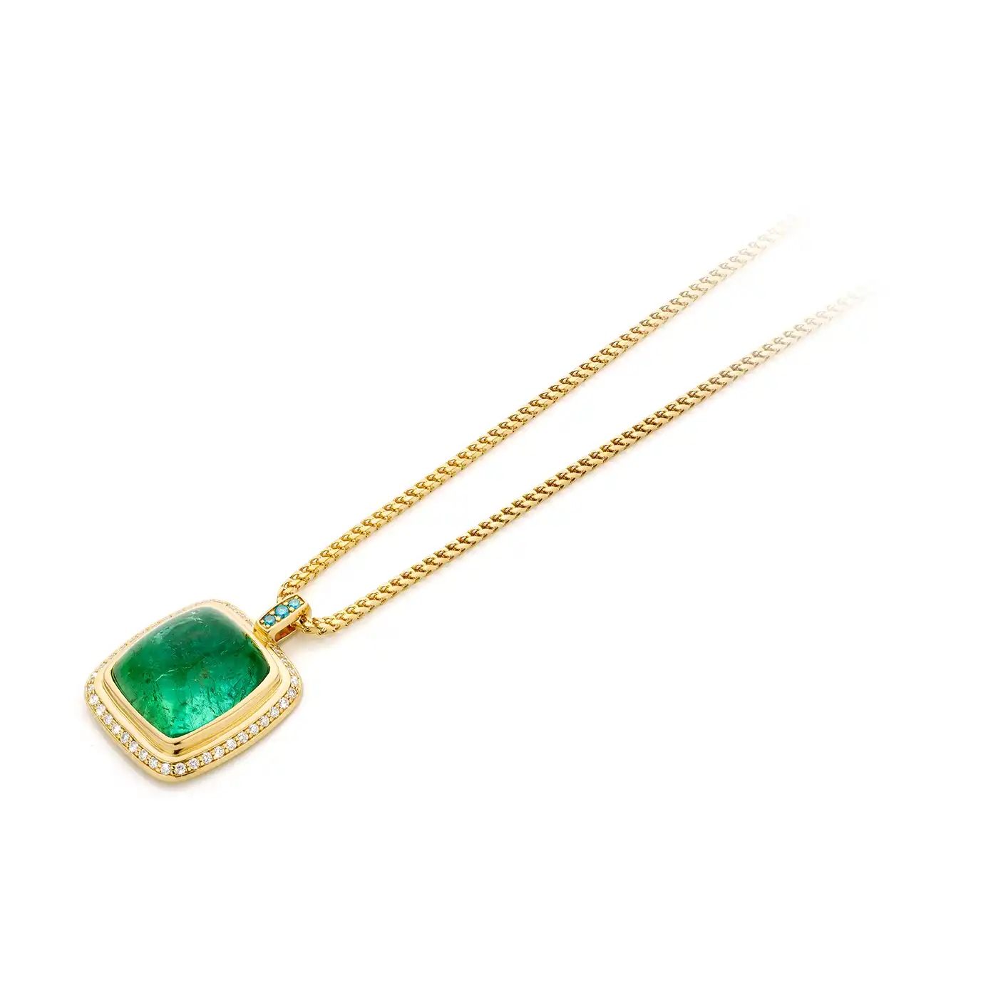 (VERKOCHT) 18K geelgouden hanger met een cabochon geslepen Tourmalijn van 16,59 ct. om de indrukwekkende steen, zijn in een band eromheen 40 Diamanten pavé gezet. In het hangoog zijn 3 blauwe Diamanten gezet.