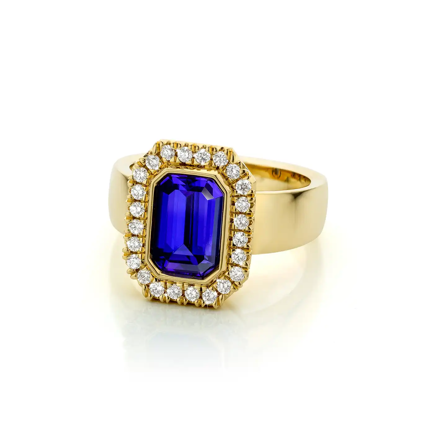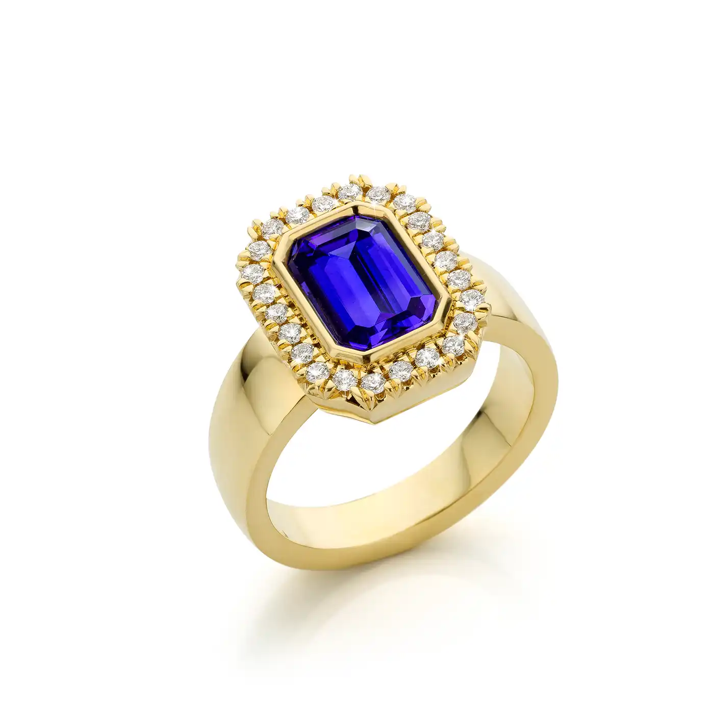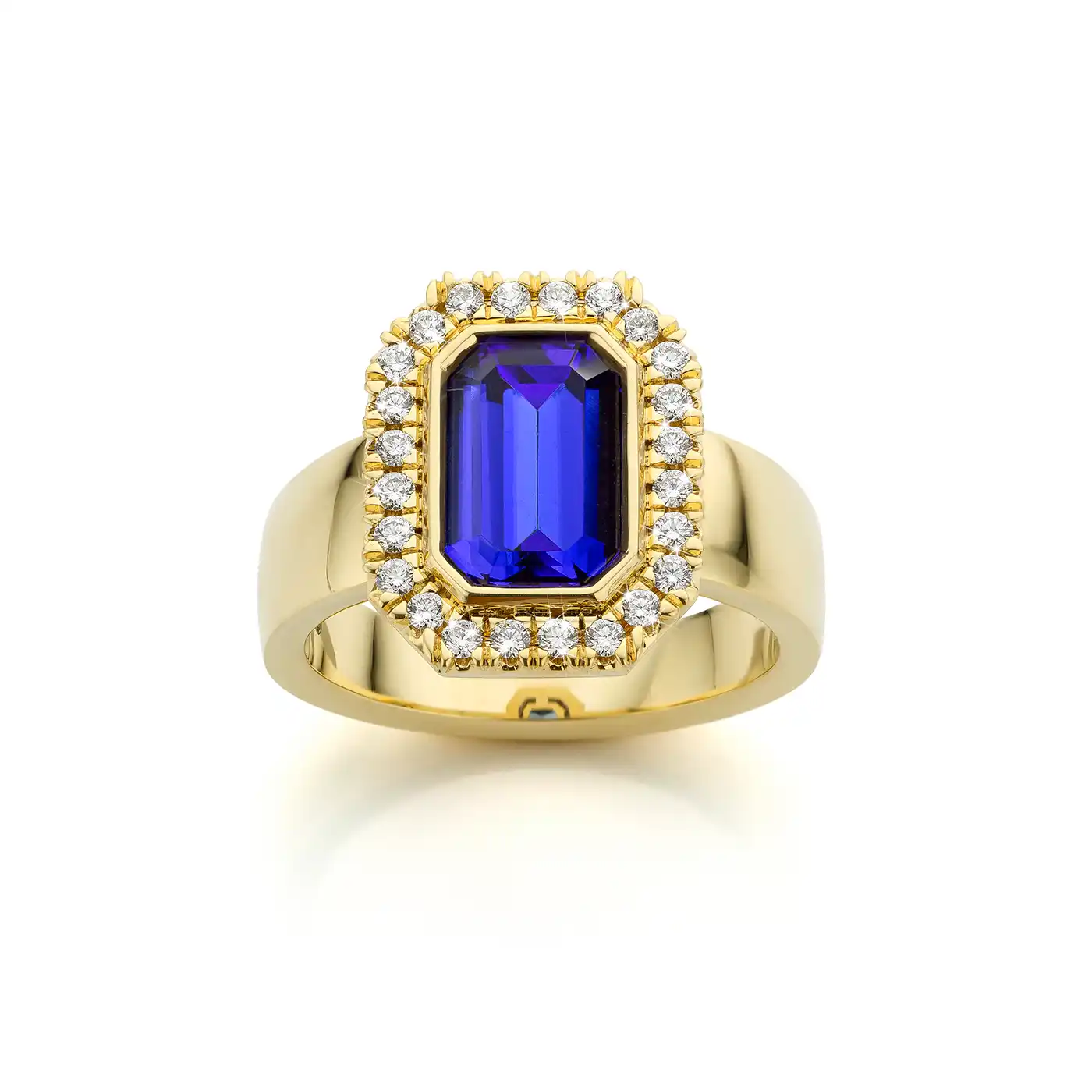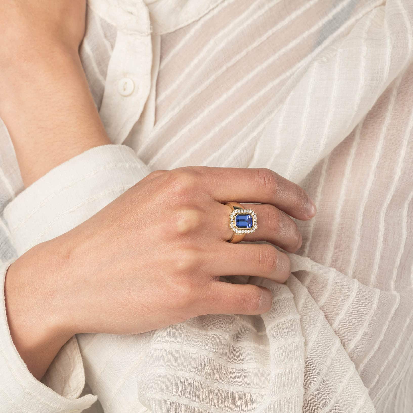 Prachtige massieve handgemaakte ring met centraal gezet een loepzuivere Smaragd geslepen loepzuivere Tanzaniet van 2,58 ct. Omringd door handgegraveerde zettingen Briljant geslepen Diamanten (E/LZ)met een gewicht van 0,28 ct. Goud Fair Trade. Unica.