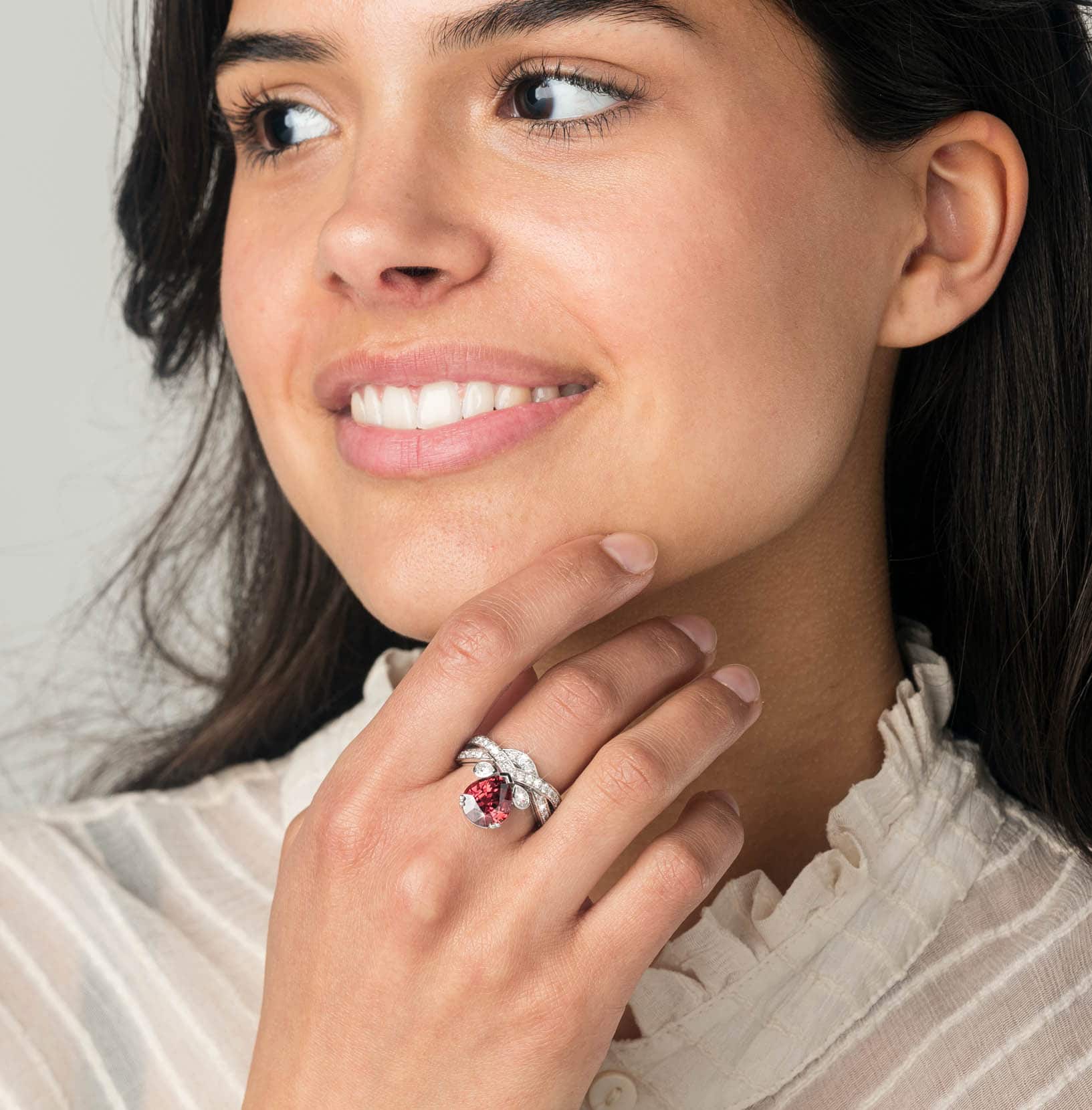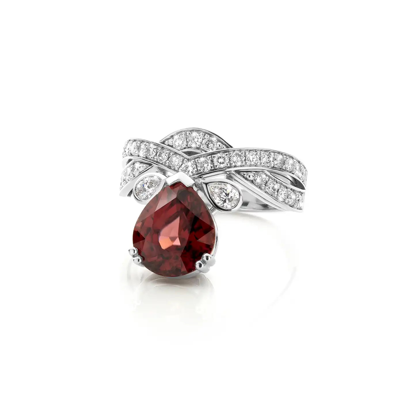18 karaat witgouden ring met rode zirkoon en diamanten.