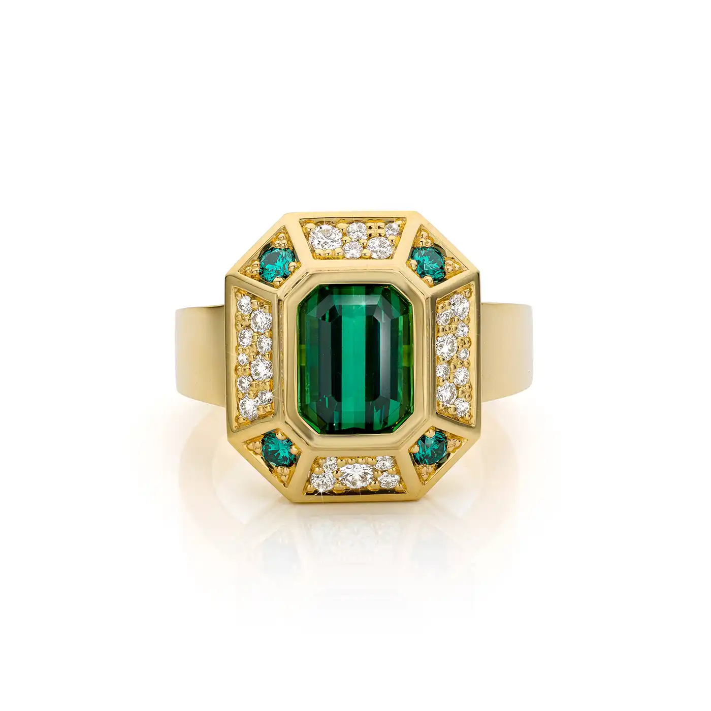 De monumentale ring is meesterlijk gemaakt. Met in het midden een heldergroene toermalijn. De Briljant geslepen diamanten omlijsten het prachtig, zijn mooi gesorteerd in een prachtig passend mozaïek. Uniek ontwerp waar nooit geen exacte tweede van komt.