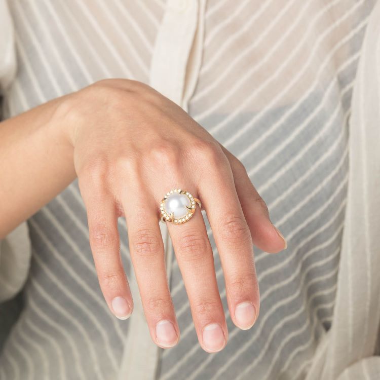 Ben je op zoek naar een uniek sieraad dat zowel elegant als uniek is? Dan hebben we de perfecte ring voor jou! Onze handgemaakte ring heeft prachtige poten die zich ontfermen over een met de hand gehalveerde, zeer grote Zuidzee Parel (AAA) van een prachtige witte kleur. Deze parel is van uitzonderlijke kwaliteit en zal zeker alle aandacht trekken.