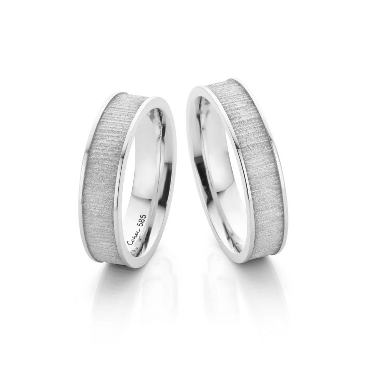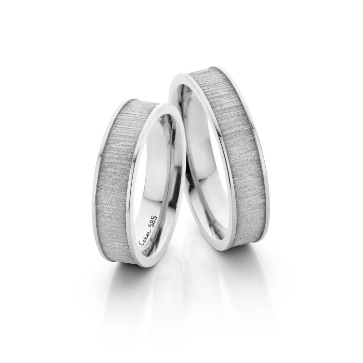 Handgemaakte trouwringen van 14K witgoud met texturen van hardhout. Elke ring is iets anders maar zal door de specifieke structuur van het hout toch elke keer vrijwel hetzelfde zijn.