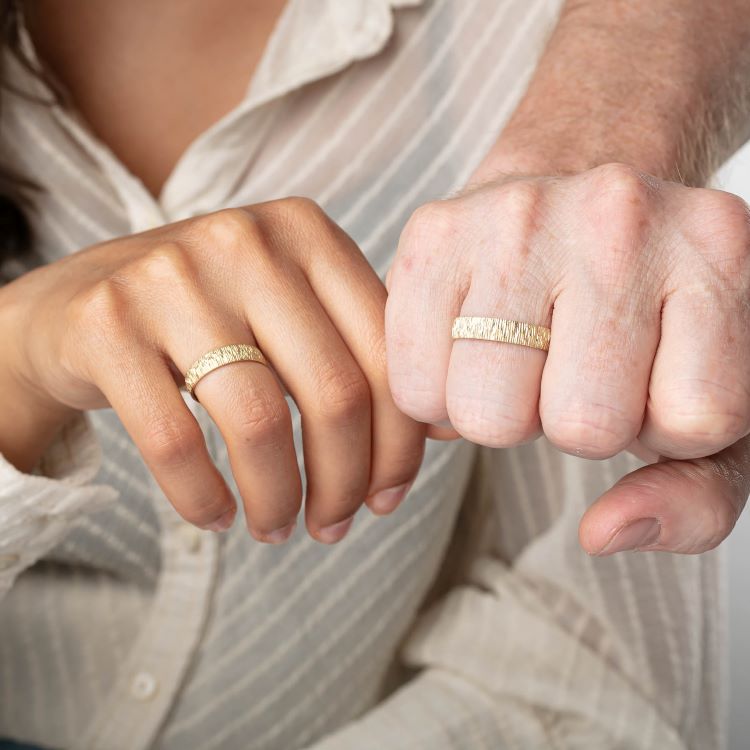 - Uniek Ontwerp: De textuur is telkens iets anders waardoor elke ring uniek is. Ook is breedte aanpasbaar, zowel breder als smaller, wat het beste staat op uw hand. Beide ringen zijn uitgevoerd met een comfortabele ronde binnenkant en geschikt om eventueel nog te worden bezet met diamant.