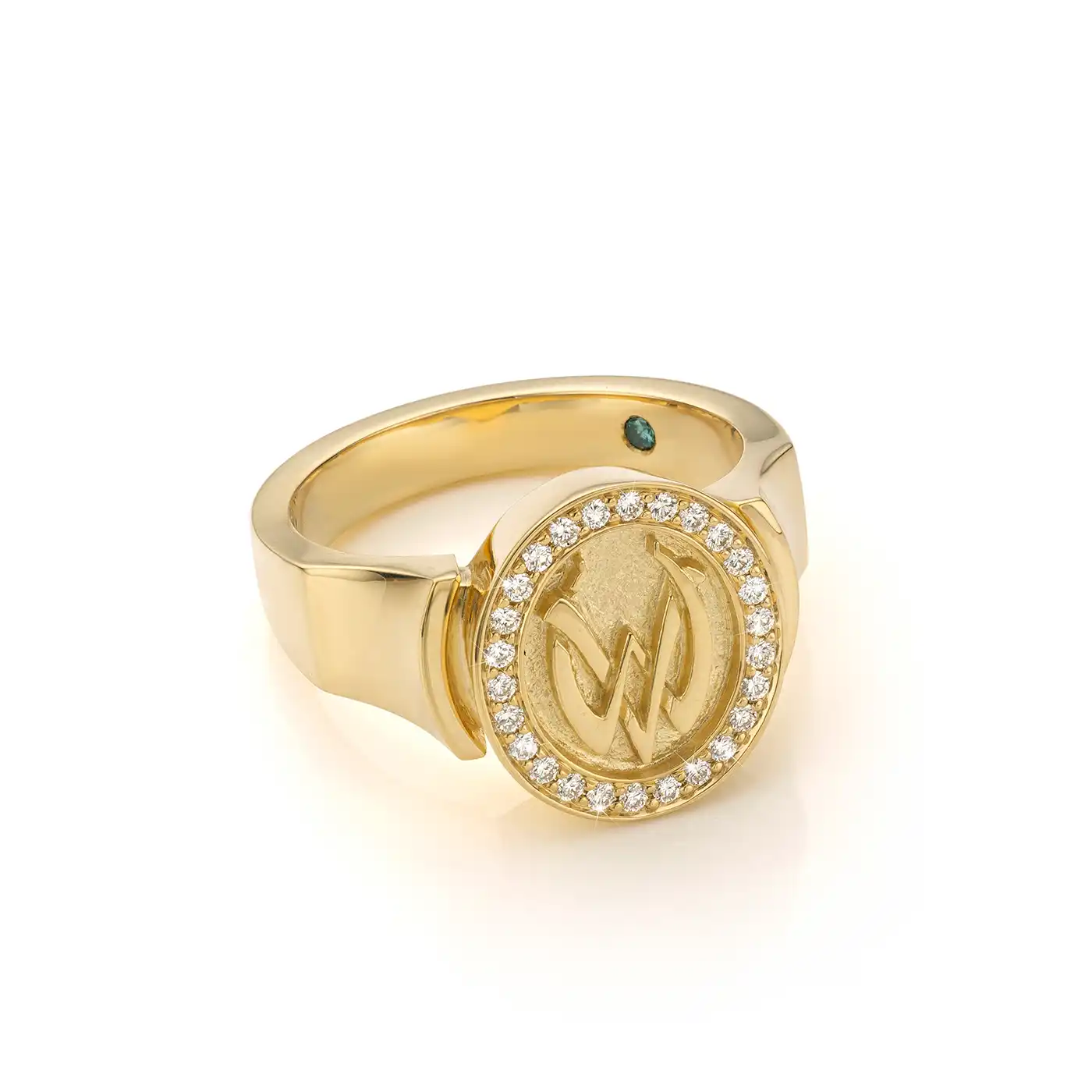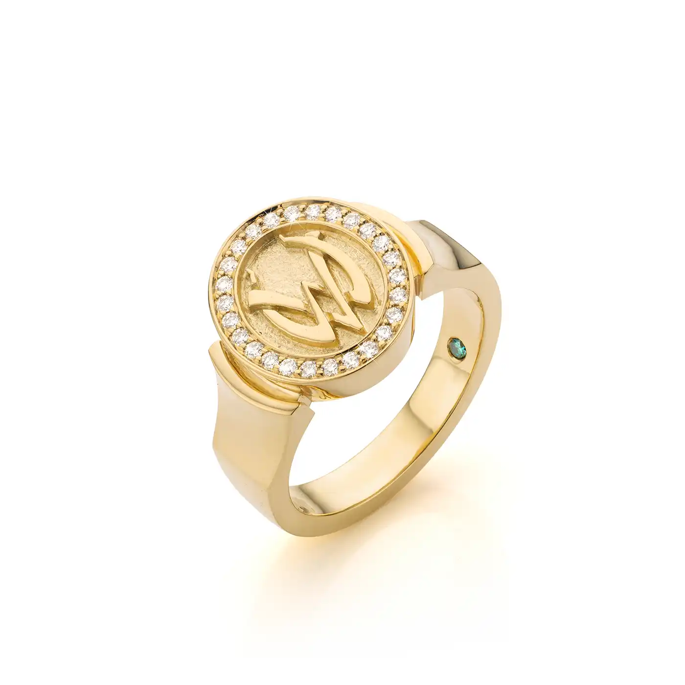 Wat deze ring zo bijzonder maakt, is dat hij volledig naar eigen wens ontworpen kan worden. Of je nu kiest voor een monogram, initialen of een ander persoonlijk symbool, alles is mogelijk. Bij deze versie van de ring zijn er rondom het monogram maar liefst 26 briljant geslepen diamanten gezet. Deze schitterende stenen voegen niet alleen glamour toe aan het ontwerp, maar geven het ook extra dimensie.