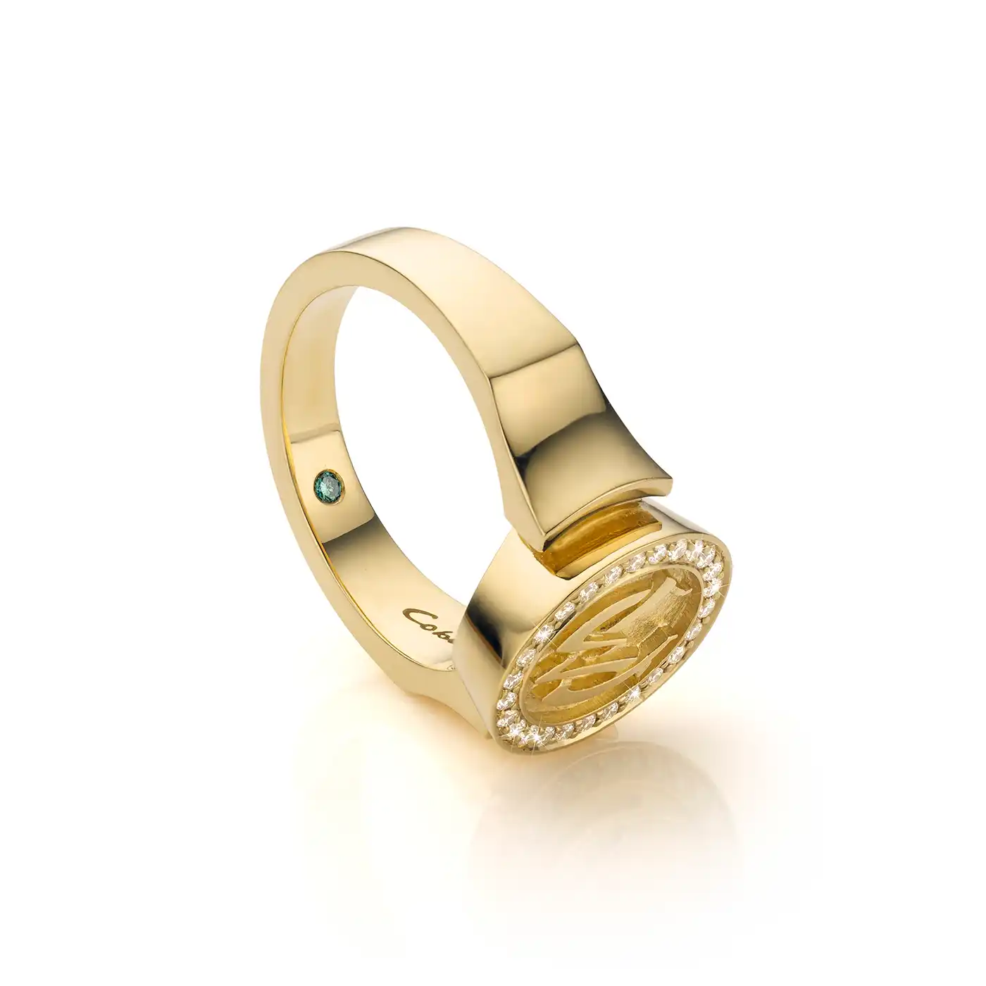 Met zijn schitterende briljant geslepen diamanten en groene diamant aan de binnenkant, is deze 14K geelgouden zegelring een ware blikvanger. Het tijdloze ontwerp en de mogelijkheid om het volledig naar eigen smaak aan te passen, maken dit sieraad tot een waardevolle toevoeging aan je collectie.